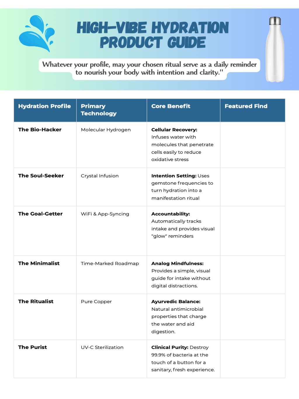 Whether you’re looking to supercharge your cellular health with molecular hydrogen, manifest your intentions through the power of crystals, or let high-tech smart bottles handle the tracking for you, the right tools can turn every sip into a moment of self-care.