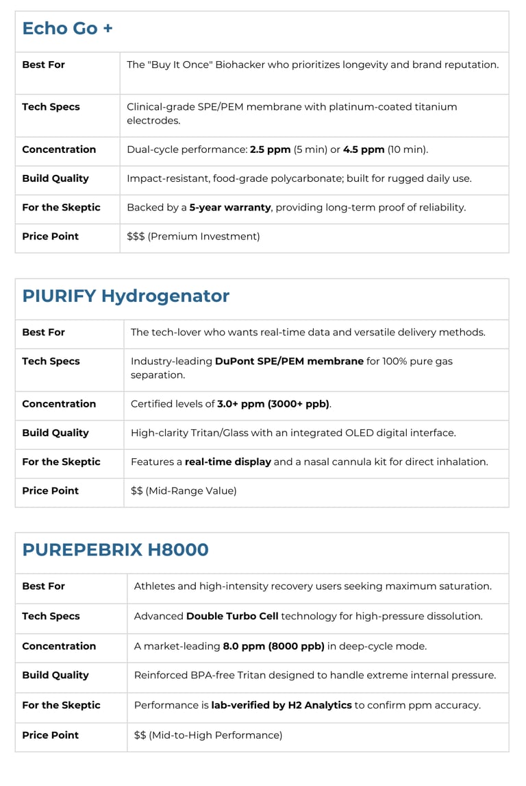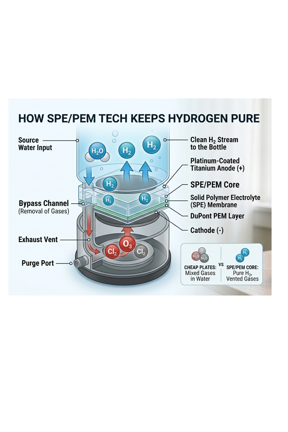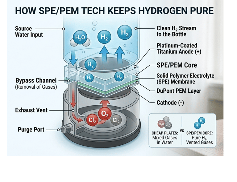 Old-school electrolysis (the cheap $30 bottles) leaves behind ozone and chlorine gas in the water. High-end biohacking tech uses SPE (Solid Polymer Electrolyte) and PEM (Proton Exchange Membrane).