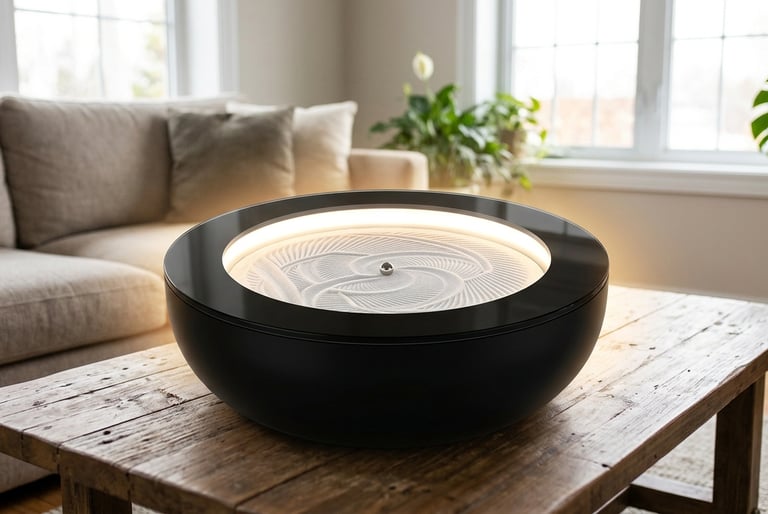 Meditation often involves focusing the mind on a single gentle stimulus, such as the breath, a mantra, or a visual point of attention. The slow movement of the Drift naturally creates that same kind of focus. As the metal sphere travels through the sand, your attention follows it almost automatically. The mind begins to settle as it tracks the gradual motion and unfolding patterns.